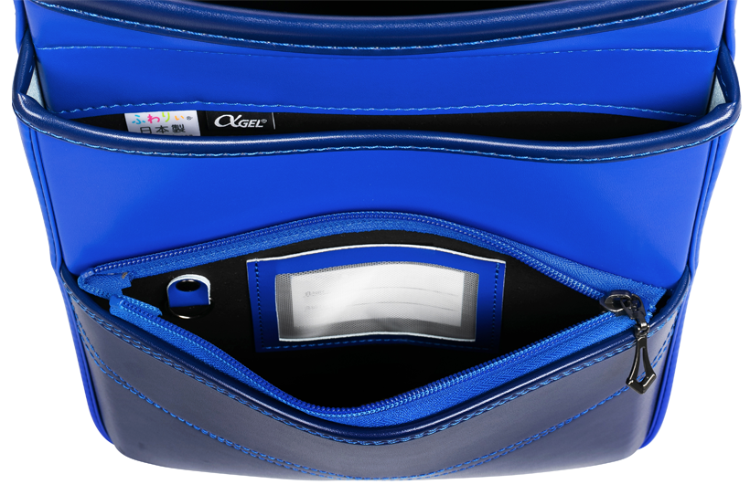 両サイドフック:ナスカン、Dカン 肩ひも防犯フック:片側Dカン ポケット内フック:Dカン 時間割表:カブセ裏面 |