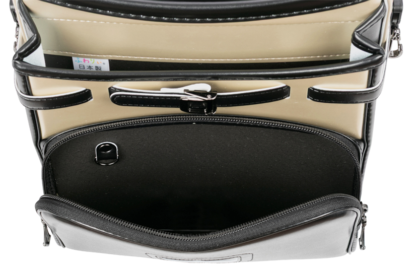 両サイドフック:ナスカン 肩ひも防犯フック:ナスカン、Dカン ポケット内フック:Dカン 時間割表:カブセ裏面 |