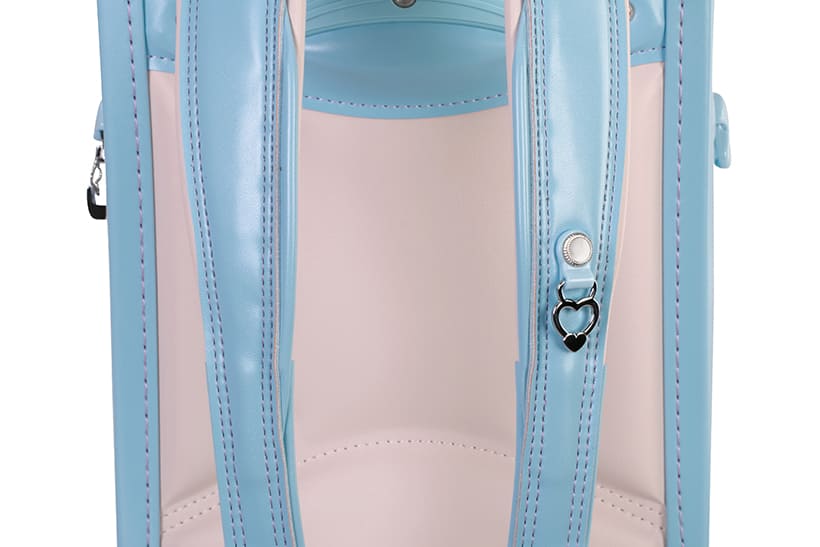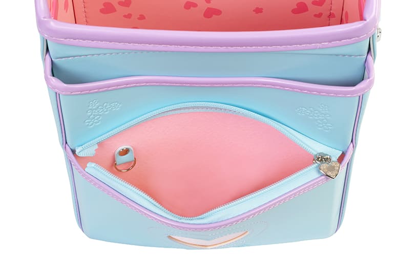 両サイドフック:ナスカン、Dカン 肩ひも防犯フック:片側ハートカン ポケット内フック:Dカン 時間割表:カブセ裏面 |