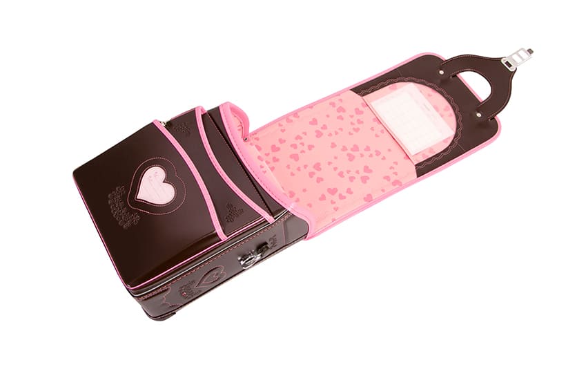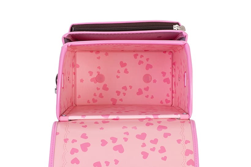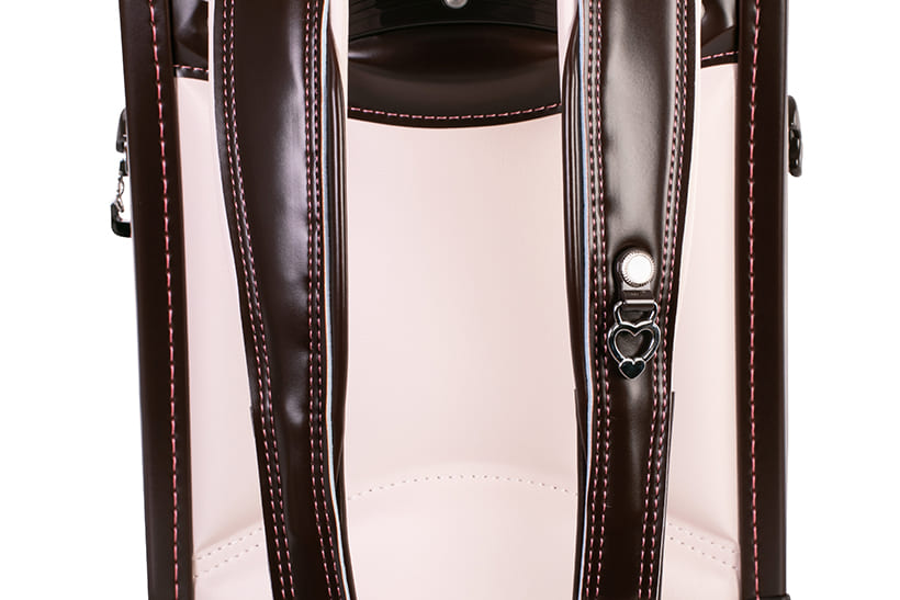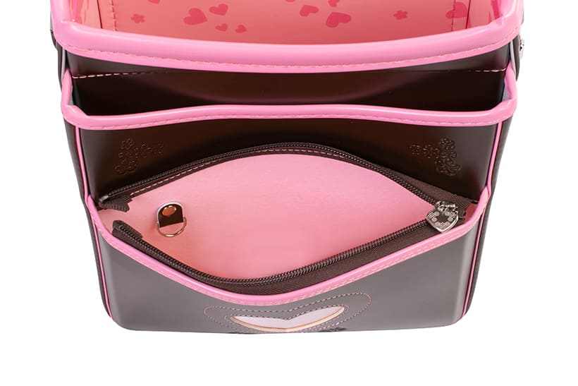 両サイドフック:ナスカン、Dカン 肩ひも防犯フック:片側ハートカン ポケット内フック:Dカン 時間割表:カブセ裏面 |