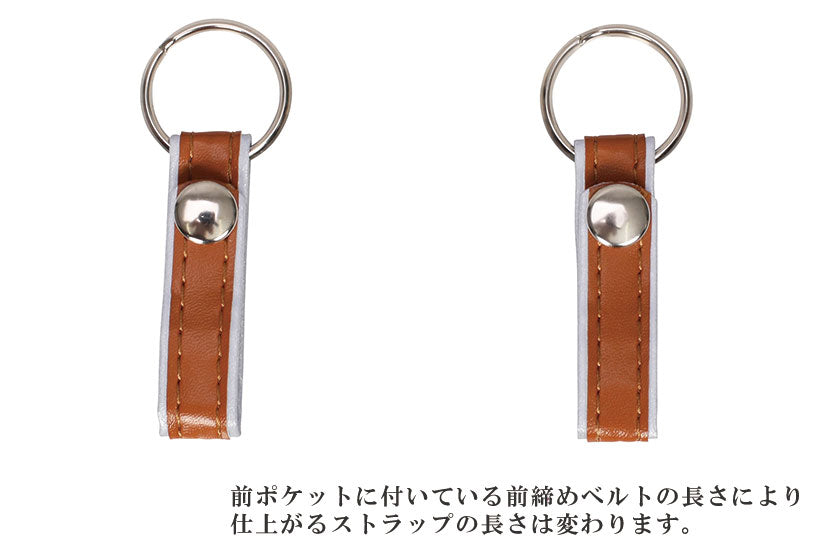 前ポケットに付いている前締めベルトの長さにより 仕上がるストラップの長さは変わります。