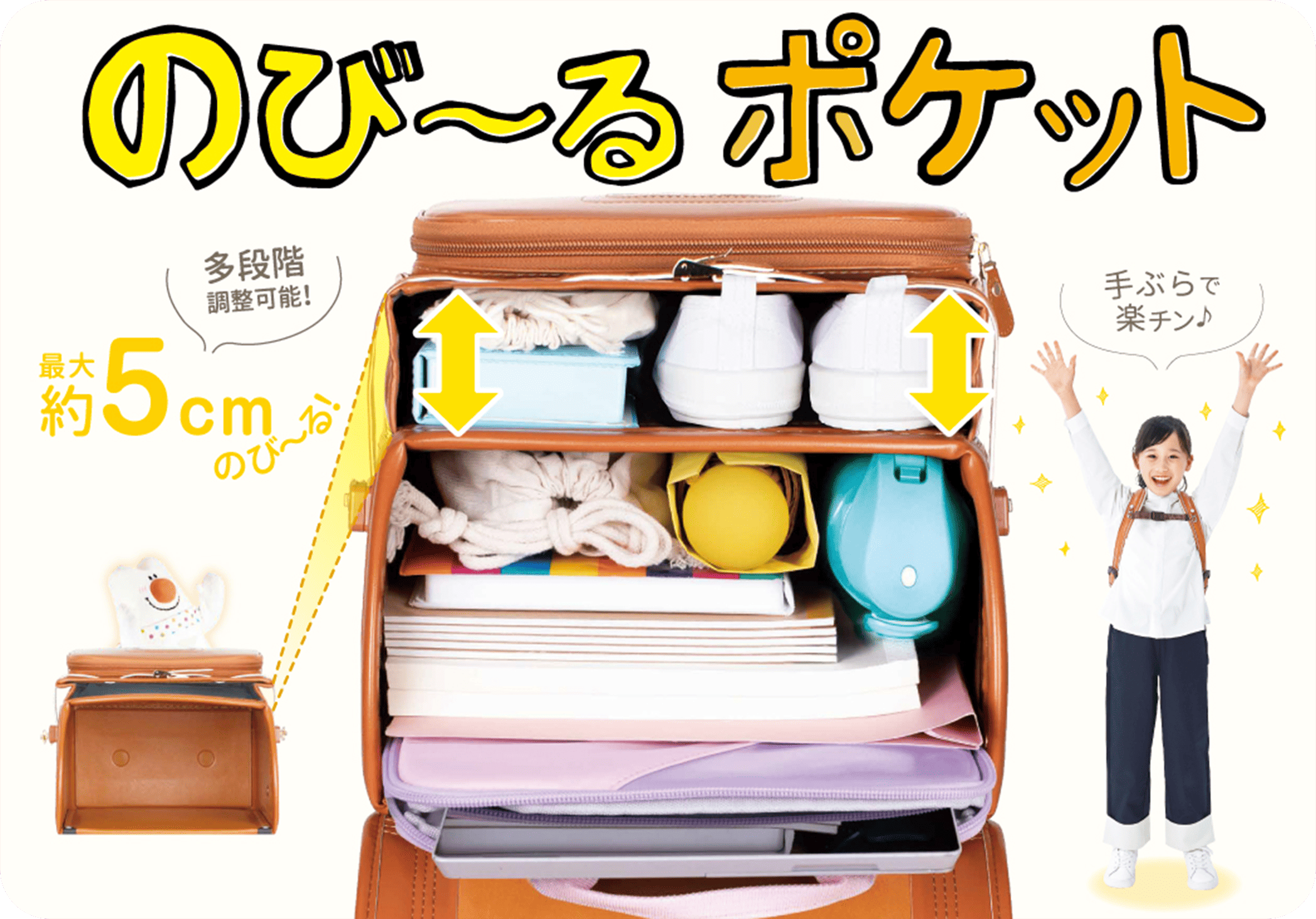 最大5cm伸びる、多段階調節可能な拡張ポケット