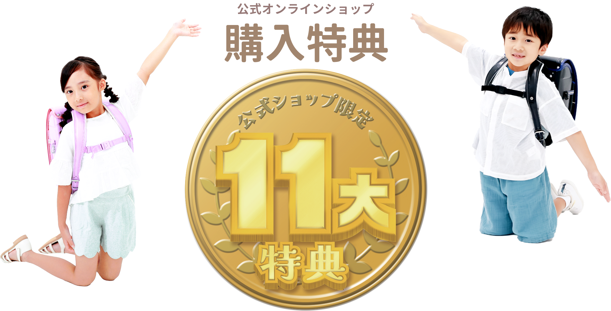 ※ 商品ページに「購入特典 おトクなクーポンはこちら」と表記があるもののみ対象となります。百貨店限定商品、きせかえNANIKA、貸出ランドセル、ランドセルリメイク、オーダーメイドシリーズ、アウトレット商品、スクールグッズ、ふわりぃキャラクターアイテムは対象外でございます。