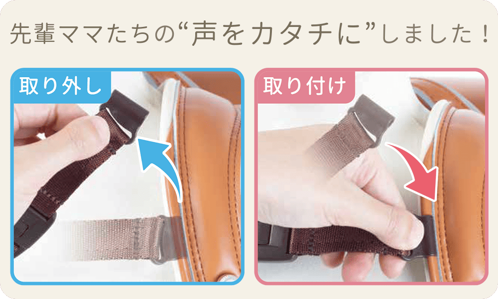 取り付けも取り外しもお子さま1人で簡単に操作いただけます!先輩ママたちのチェストベルト支持率は驚異の94%!