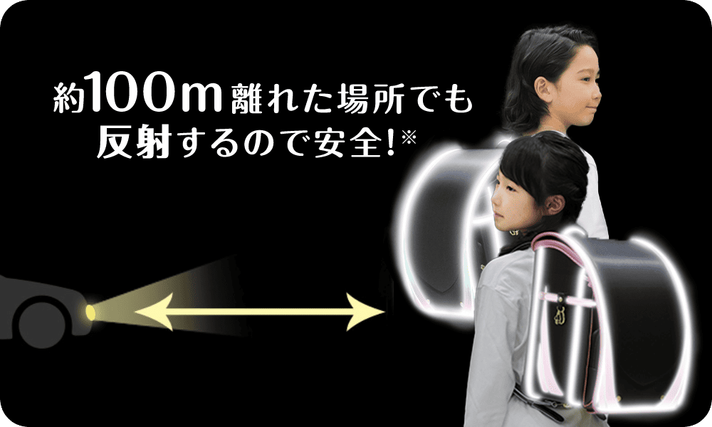 安心して通学していただけるように、高輝度反射機能を搭載。720度どの方向からでも光るようにカブセ・両サイド・肩ひもに反射材を多数搭載しました、暗い道でも車のライト等を反射して約100mの場所からお子様の存在をアピールします。