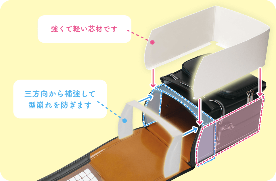 軽くて強い「エフセルエコライト」と三方向補強 の「ガッチリガード」で型崩れを防ぎます!